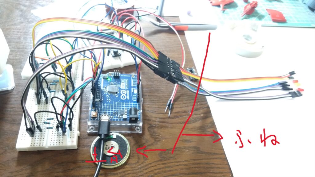 船側のLED配線は、延長可能です。こう見ると、土台側のボリュームがかなり多いですので、もっとコンパクトにしたいです。やはり、ユニバーサル基盤への移植を考えたほうがよさそうです。