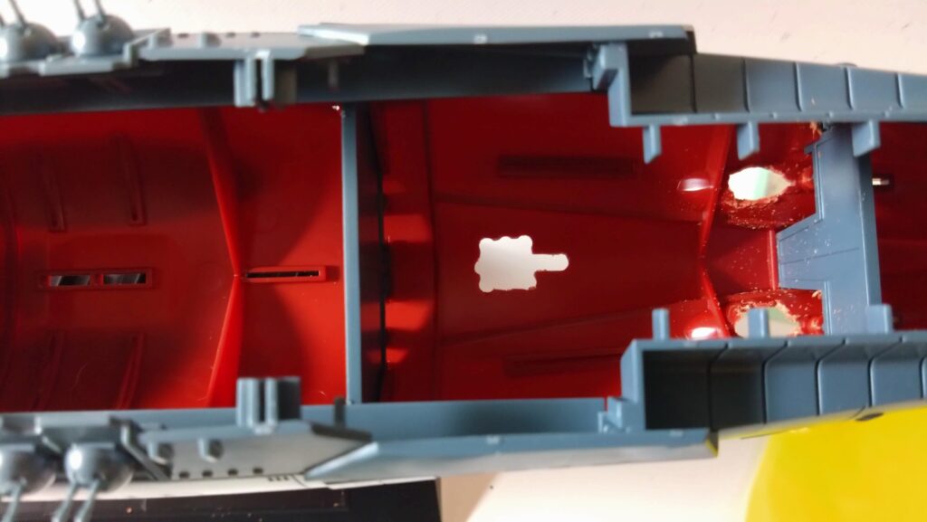 さて次は、配線を船体に取り込む場所と方法ですが、船体底部の後部付近に穴を開けることにし、配線を通すことにします。
