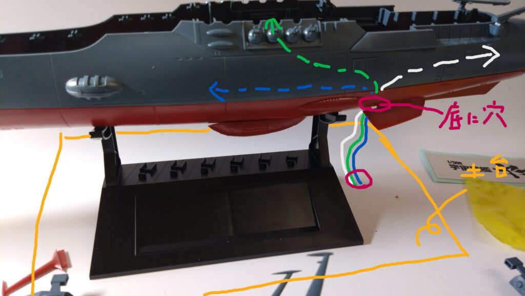 引き続き、1/500宇宙戦艦ヤマト電飾計画です。前回は主に1/500宇宙戦艦ヤマトにLEDを組込むためにエンジンや波動砲などを掘削を行っていたのですが、今回は 土台と本体をつなぐ配線の経路についてです。