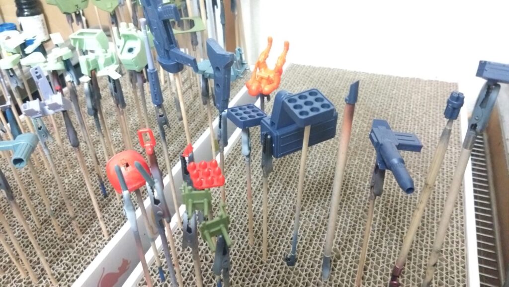 ということで、塗装するための準備として、ネコの手ツールでパーツを挟んで並べていきます。