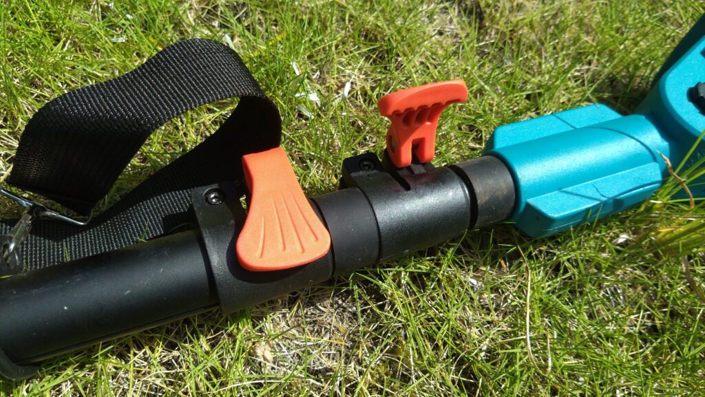ちなみに、高所の場合はこんな感じで使用します。重いバッテリーは伸縮ポールの下に装着し、操作は根元のグリップで行います。その伸縮ポールは、販売サイトの商品紹介では最小1.35m~最大2.7mとなっております。自分の身長や工具の高さと合わせると最大5.0m近いところまで届くと思われます。ただし実際には、伸縮ポールを伸ばせば伸ばすほど腕力が必要になり、4.0付近が限界ではないかと思います。そして、切断能力としては枝の太さ、20cmぐらいまで可能だと思います。