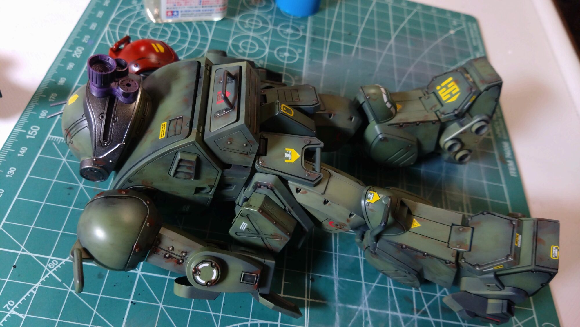 初めてこういう風に汚していっているのですが、下地色が緑ということが良いのかもしれません。雰囲気が出ますし想像がしやすいです。白いガンダムではハードルが高いかもしれませんね。