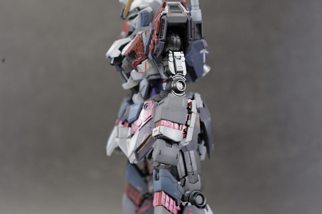 続いて、側面からの腕部について、内部フレームの光沢がポイントです。(光沢パーツがある場合、撮影時の光量を少し減らすべきかもしれないと反省)