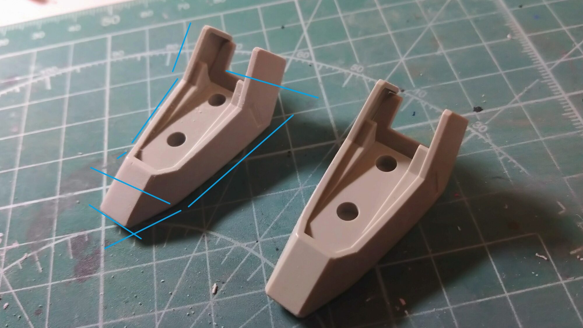 さて、では別記事内容にもありましたが、ここからはどのように表面修正の方向性を決めるかです。このパーツは脚のパーツです。右が未処理、左が軽く削った後の様子です。つま先を先細りして削ろうと思います。