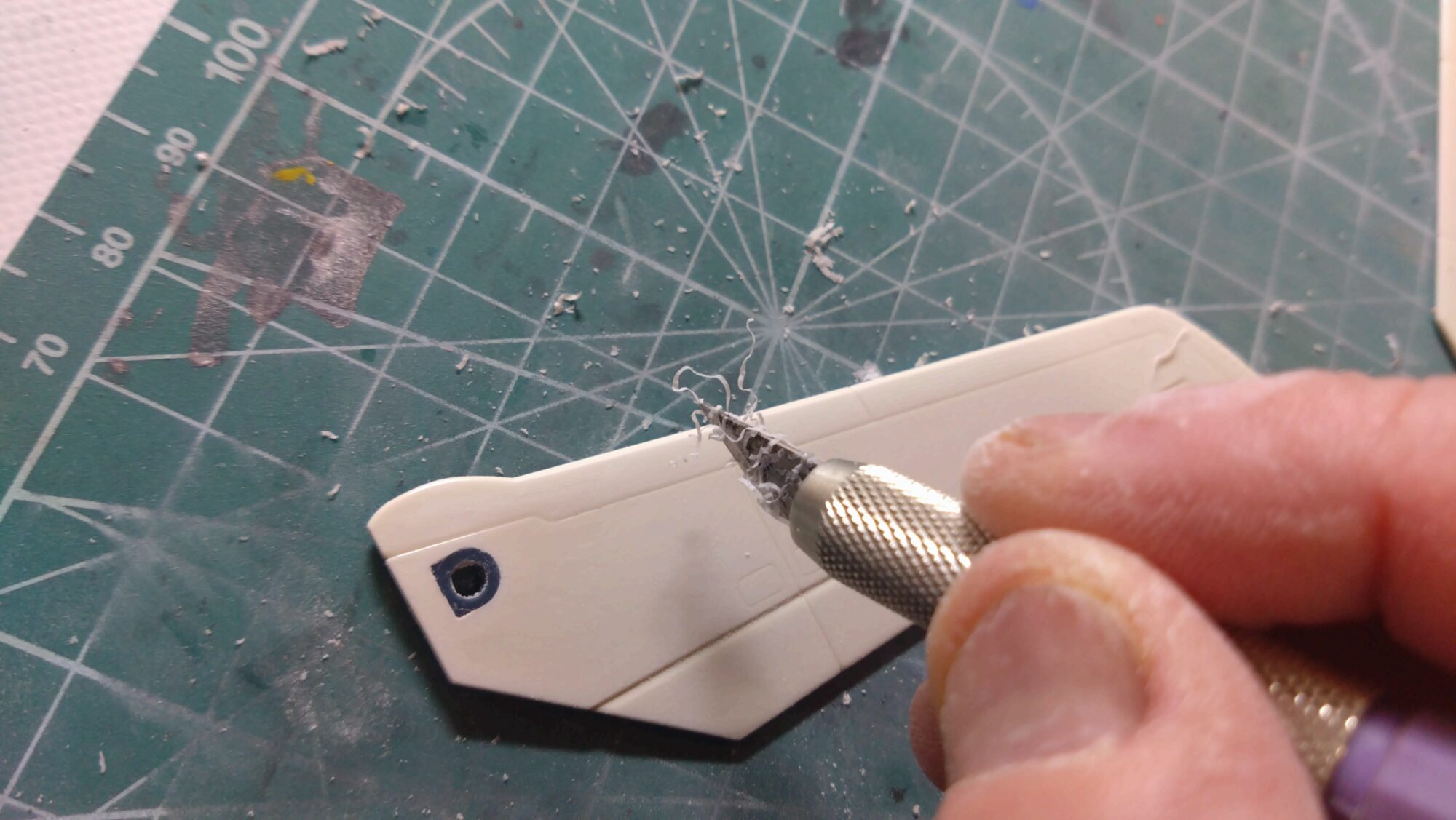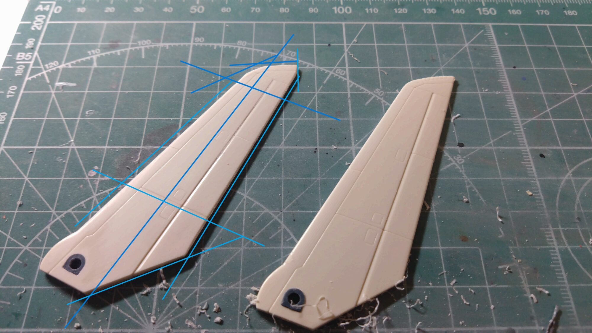 翼に関しては、スジ彫りが割と深いので遠慮なく表面の厚みを削りました。全体的にもう少し薄ければよいなあと感じましたので、後程の工程に託します。ちなみに、翼の先に角を付けています。