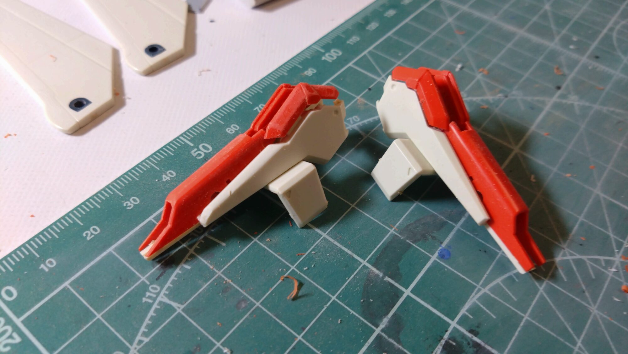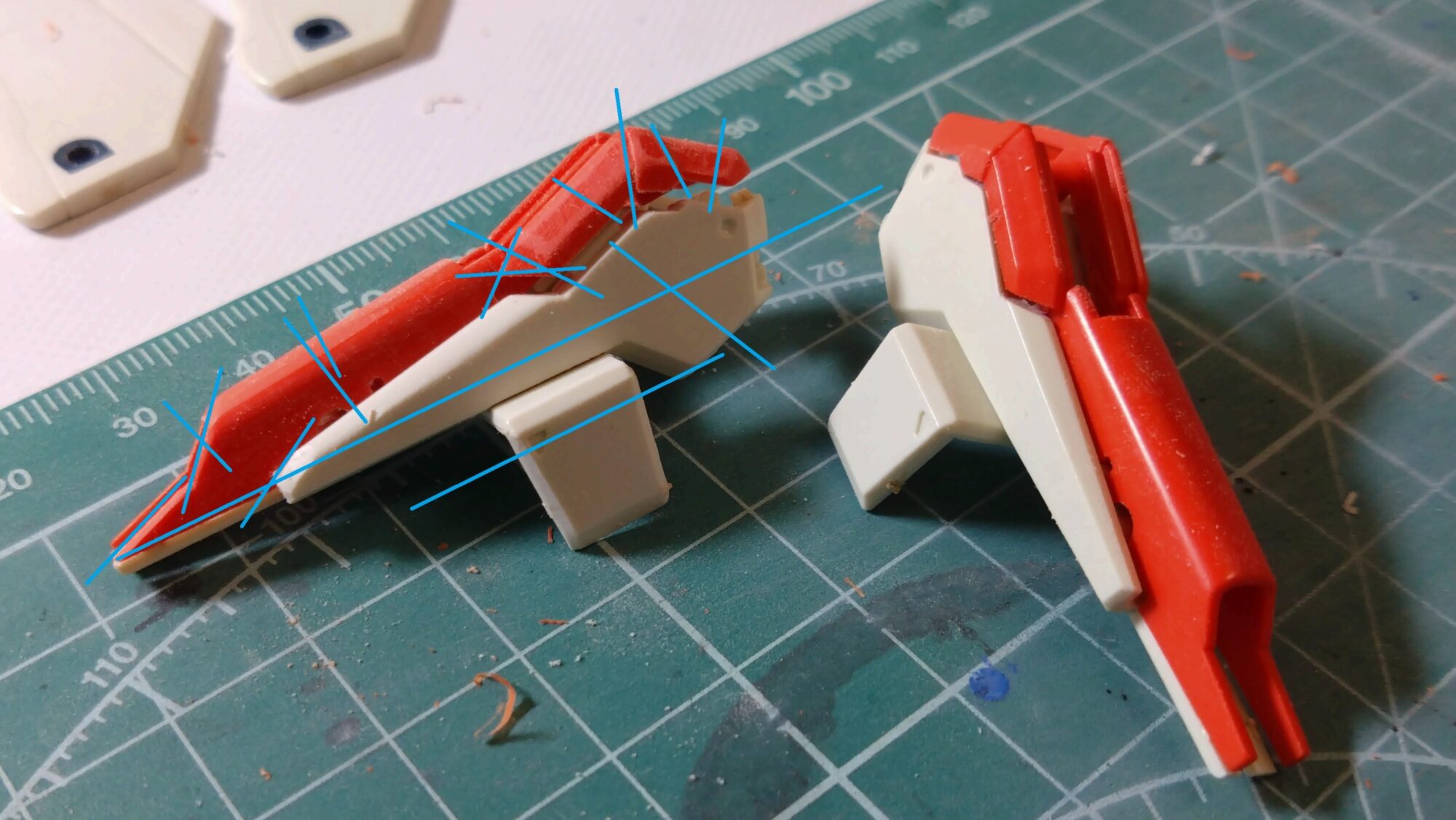 パーツの端部分、プラスティック成形により丸くなっているので削って尖らせて、スマートに見せました。左が加工後。