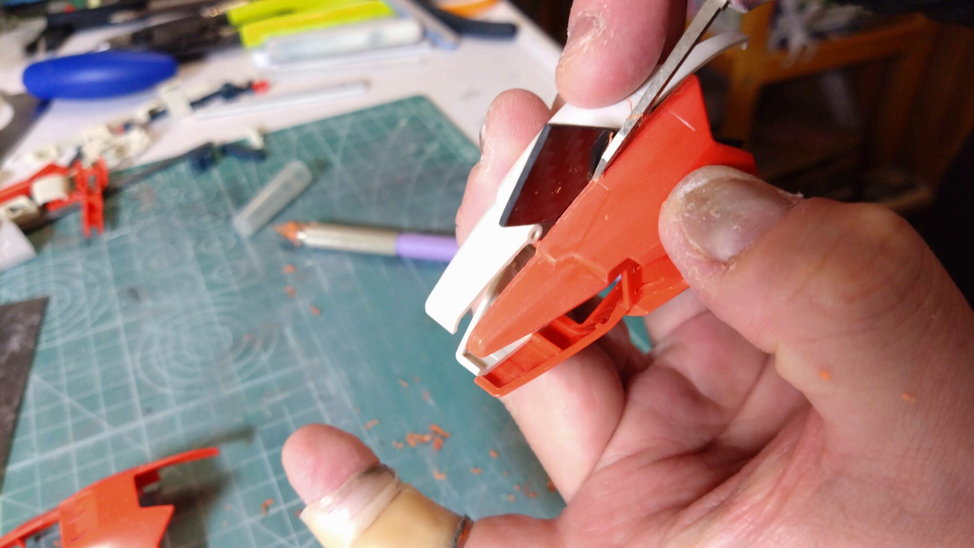 さて前回は、スジ彫りするためのスジ書きを描いたのですが、今回は実際に、中古MGゼータプラスC1型にディティールを追加します。外装パーツに段落ちモールドやスジ彫りを追加していきます。