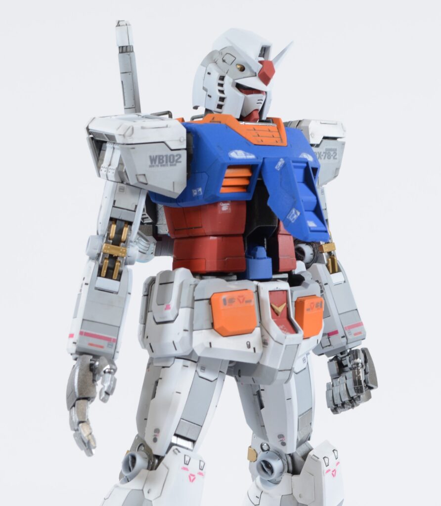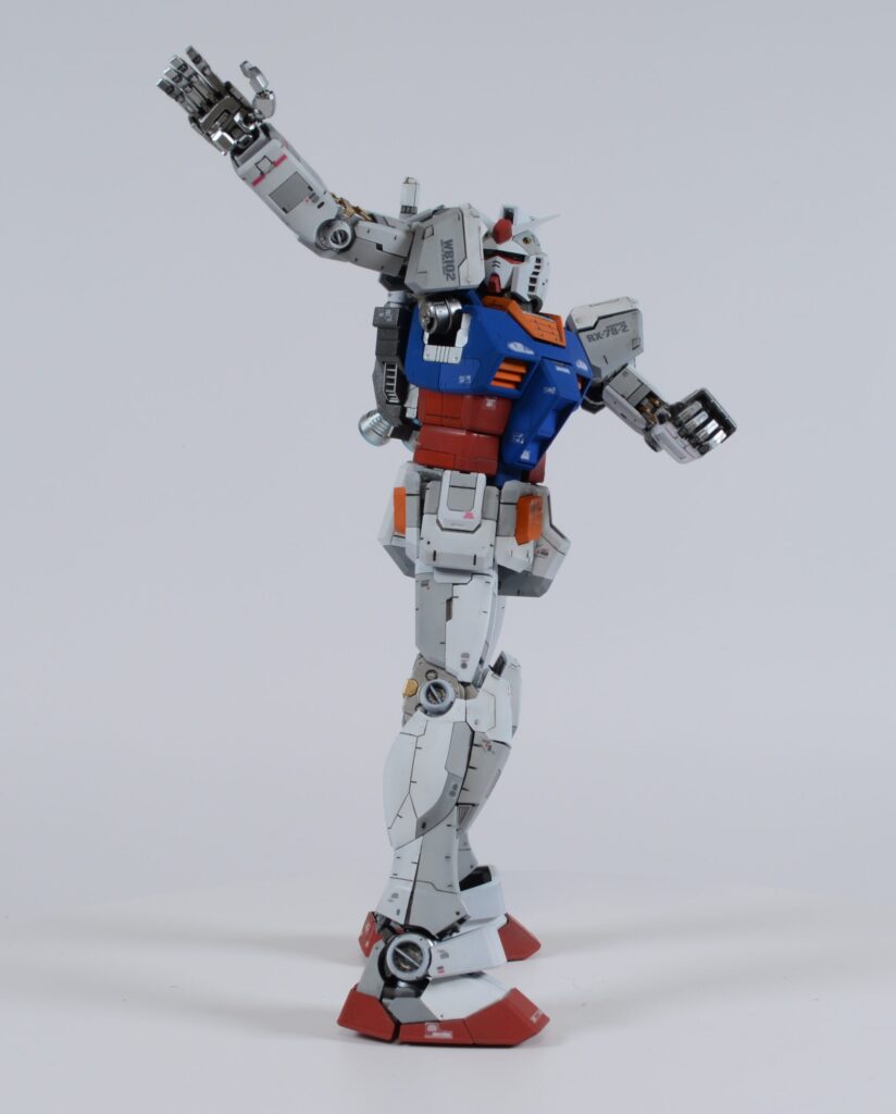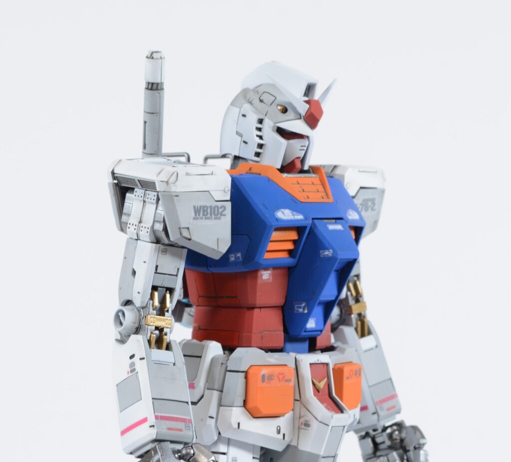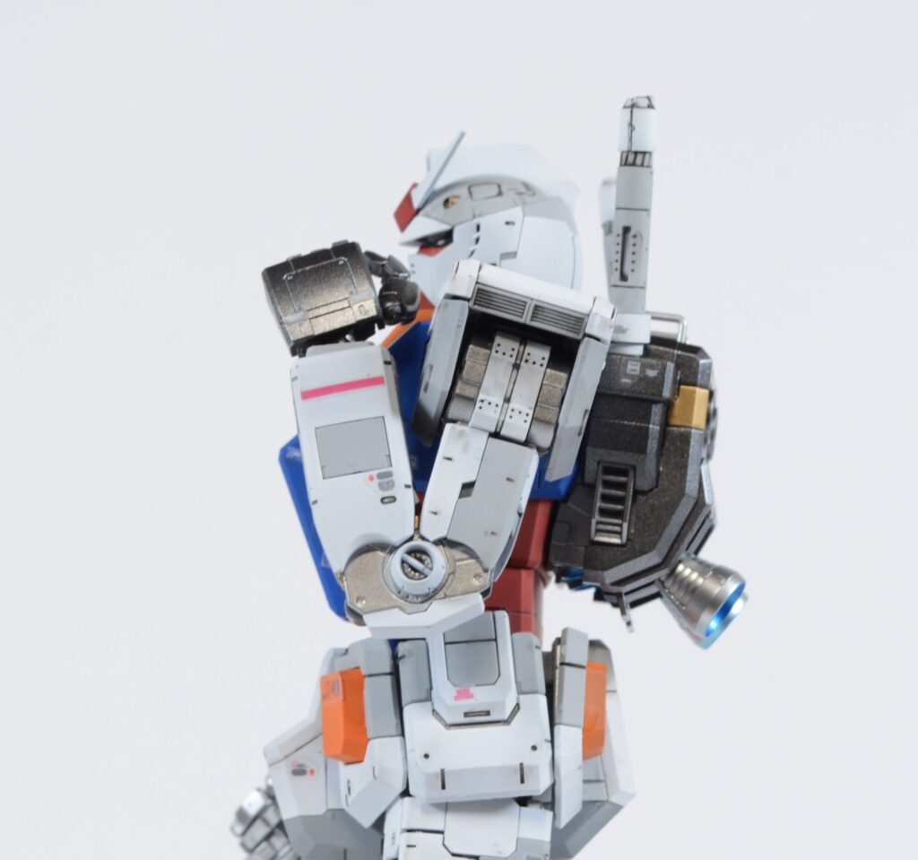 真っ白なガンダムではなく、少ーしだけ現実的な・・、リアルよりな・・・、というカラーリングにしてみたかったRX-78-2ガンダム。ですが、青、赤、黄色のトリコロールは維持したい。そこで今回の塗装、”連邦の白い悪魔”にふさわしいカラーリングになっていればうれしいですが。