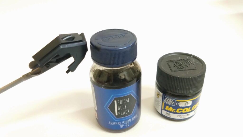 まず、成形色の黒色部分には、最近の定番、プリズムブルーブラックを使用します。ただし、青みを薄くしたいため、ブラックを少し足して調合します。