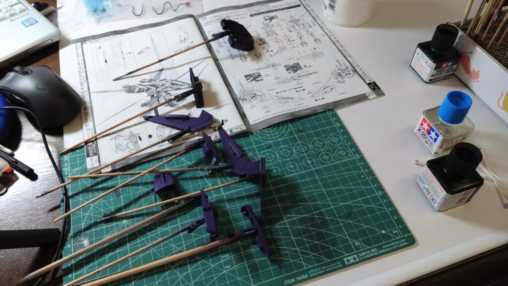 次に、武装やスラスターなどには、上の残った塗料にメタルブラックを調色して使用しました。