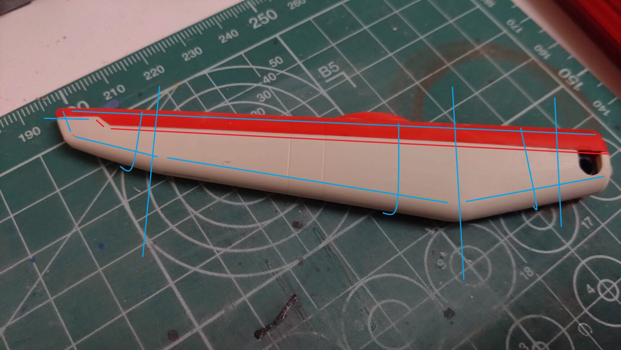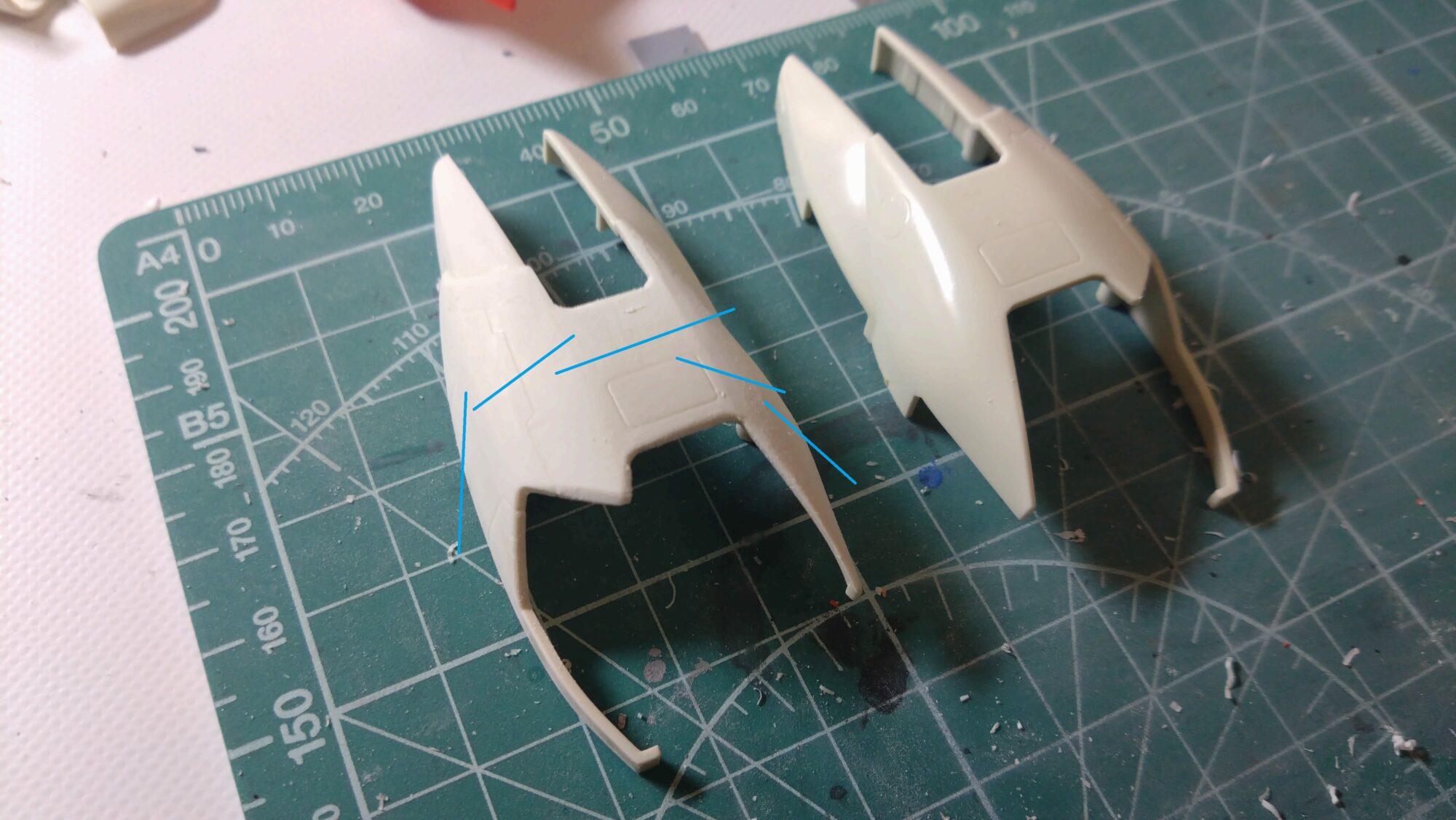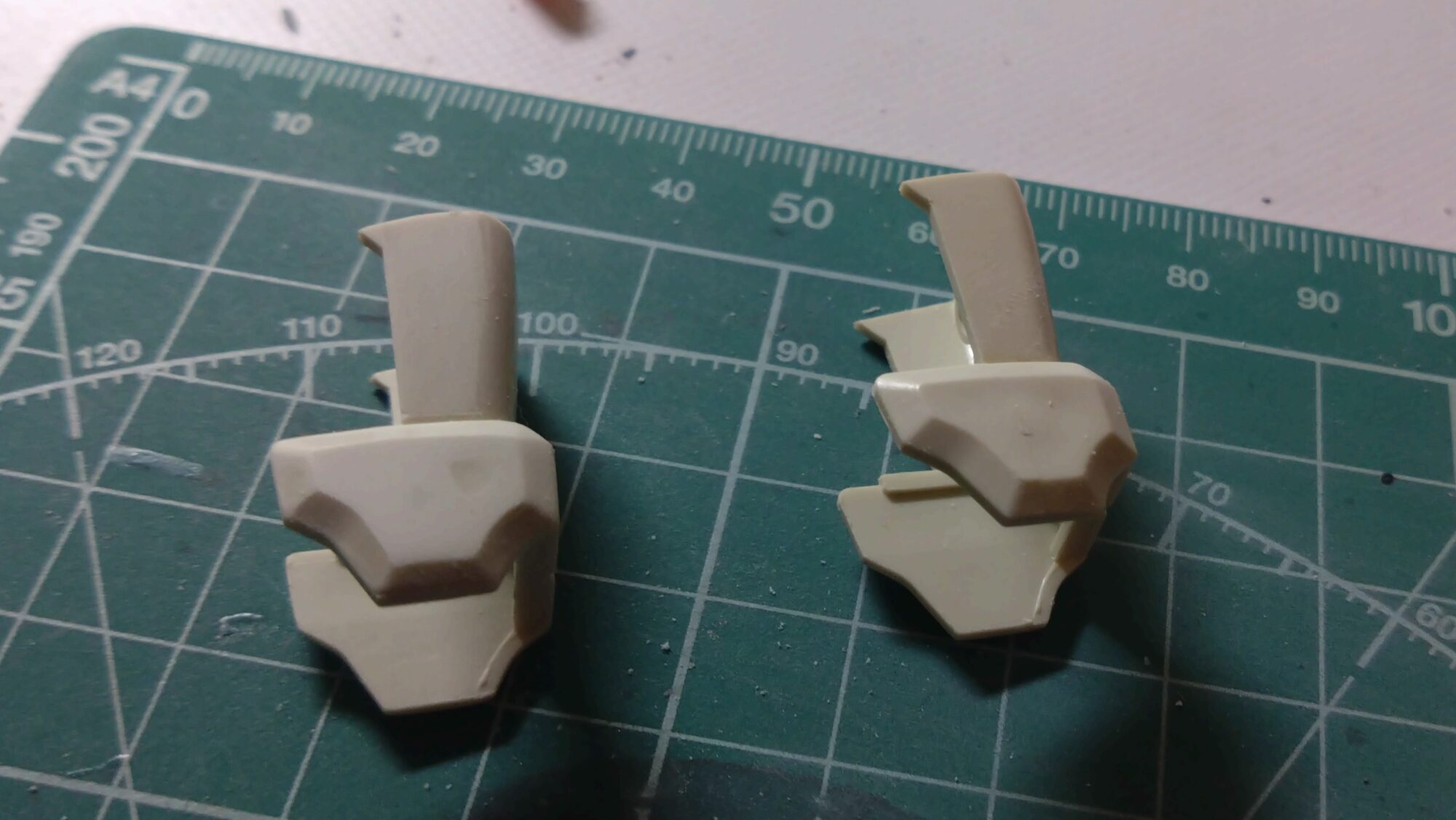 背面のスタビライザーですが、当初は合わせ目消しで対応しようと思ったのですが、色の違う箇所で段落ちモールドを追加しようと思います。