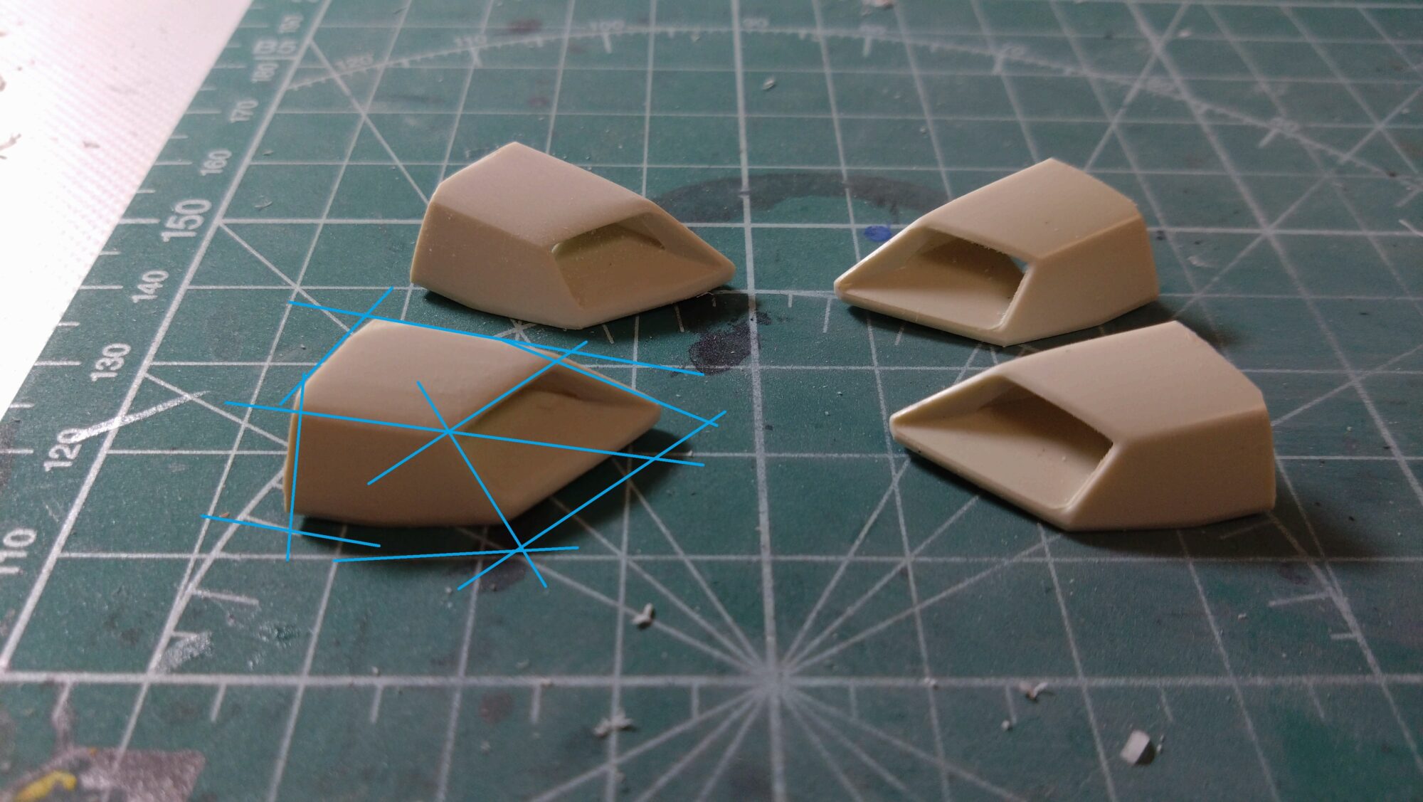 ゼータプラスの特徴に、脚部の緩やかな丸みを帯びた形状があげられると思います。ただ、表面を削ってみると、図のような面構造にしても面白いかもしれないと感じました。ですが角を出すまではせずに、表面を削るイメージとしては図のような段階に分けてみました。