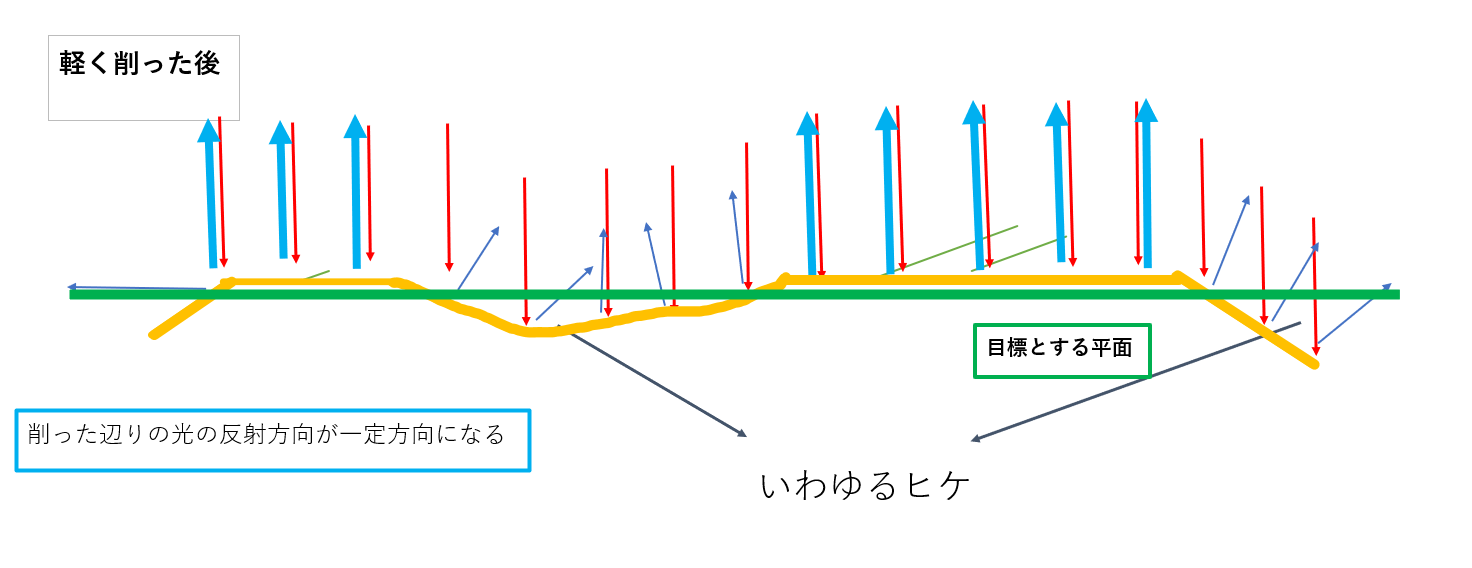そこで、最初に申し上げたように、表面を軽く擦る(削る)事によって、図のようにある程度の面出しの方向性が見えやすくなるのだと思います。おそらく理由としては、一部平面になった箇所の青太矢印が多くなったので、本来の平面の認識が強化される事が一因だと思います。