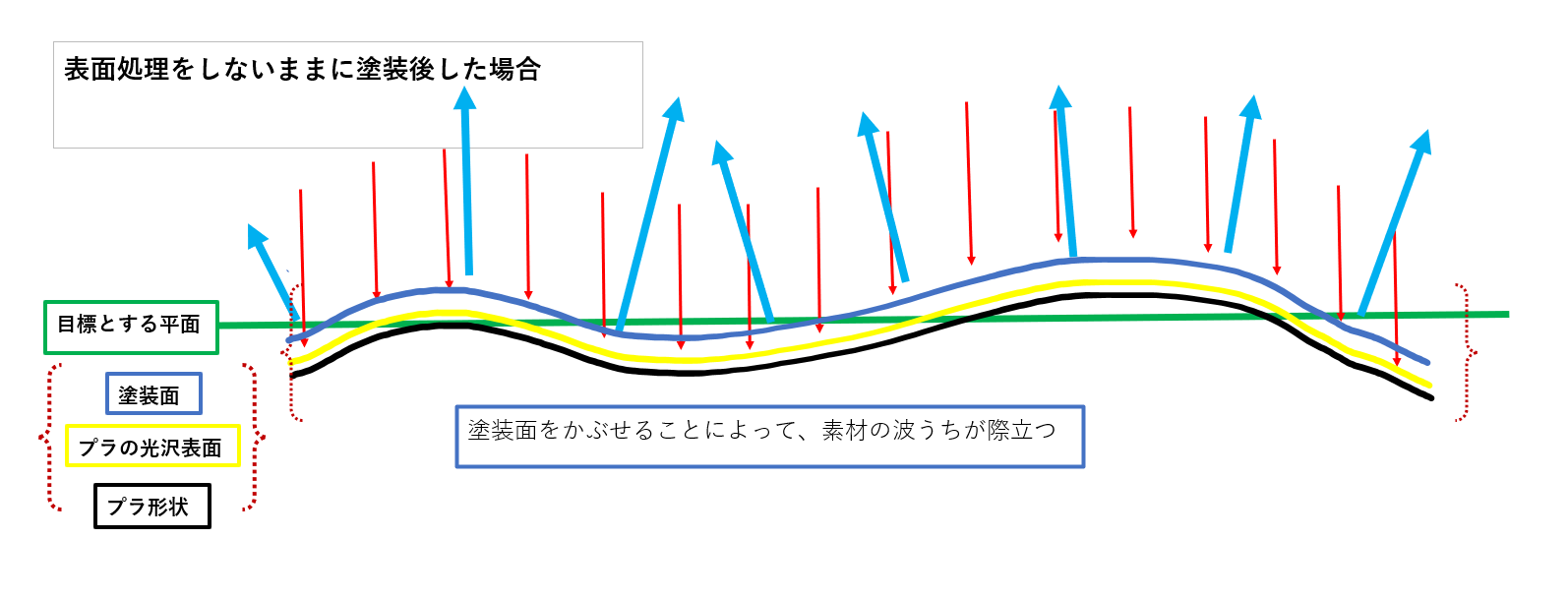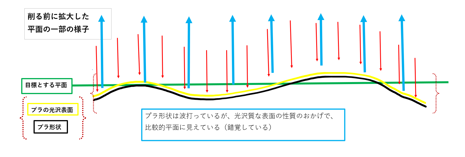 これは、推測でしかないのですが・・・。そもそも、ガンプラのパーツの表面は光沢に仕上がっております。さらにその本質は図のように微妙に波打っているのだと思うのです。(少し大げさに表現してますが。)おそらく、金型技術の関係で昔のキットほど顕著にこの現象が現れると思います。そこでこの状態の結論としては、緩やかに微妙に波打っている平面ではあるのですが、光沢質な素材であるがために、ぱっと見ではその緩やかな波打ち形状を平面と錯覚してしまい、勘違いしている状態だと思うのです。