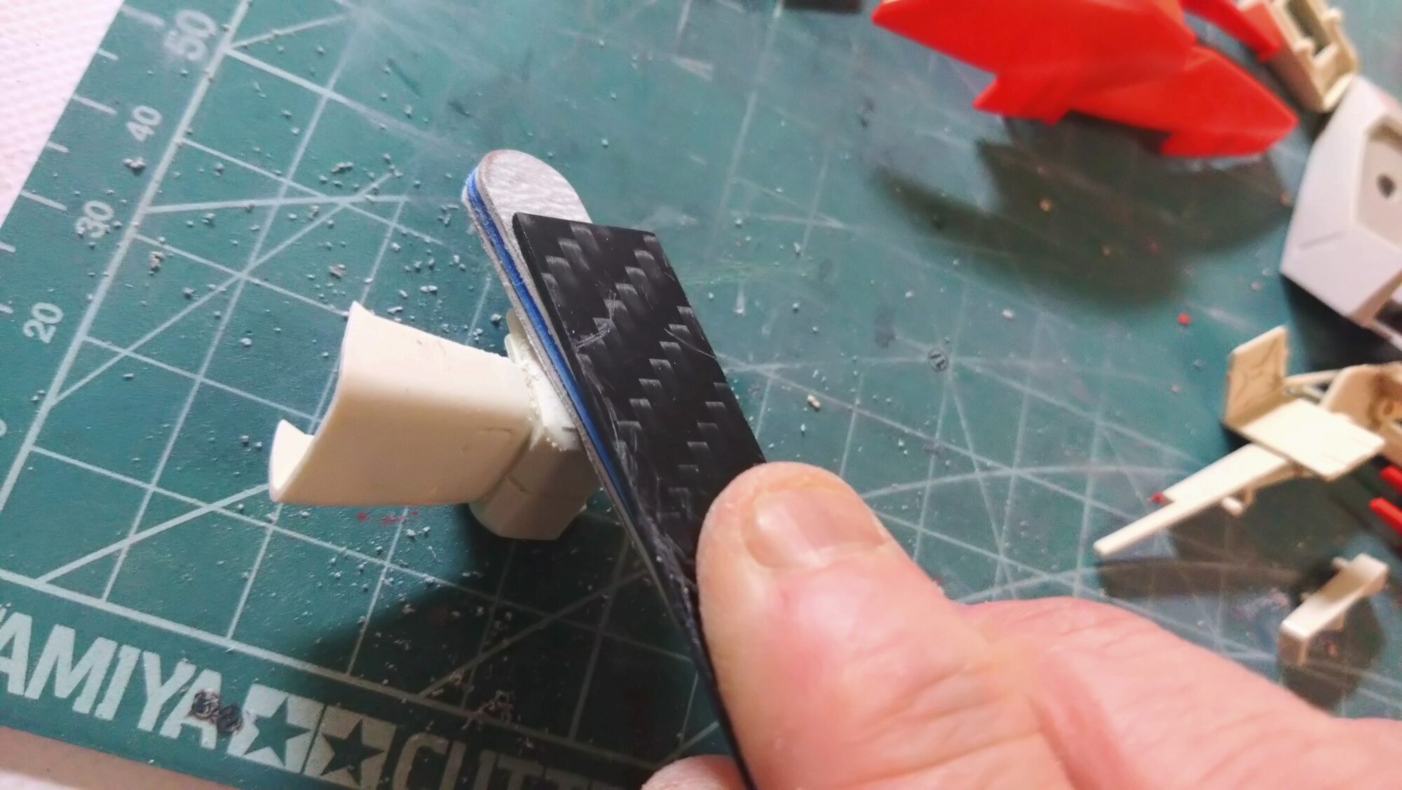 画像にはないのですが、中心を砲身が設置されてビームキャノンとなるパーツの外装です。軽く表面を削って様子を見ていたのですが、少し丸い部分が多いため、角を作ってみました。