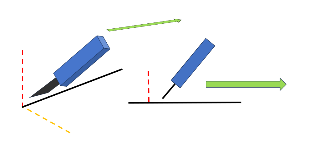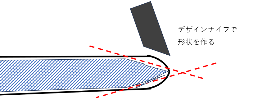 デザインナイフで形を作っていくのですが、切るのではなく、何度もカンナ掛けして削いでいきます。図のように滑らす先に刃を立てずに寝かせ、削いでいきます。