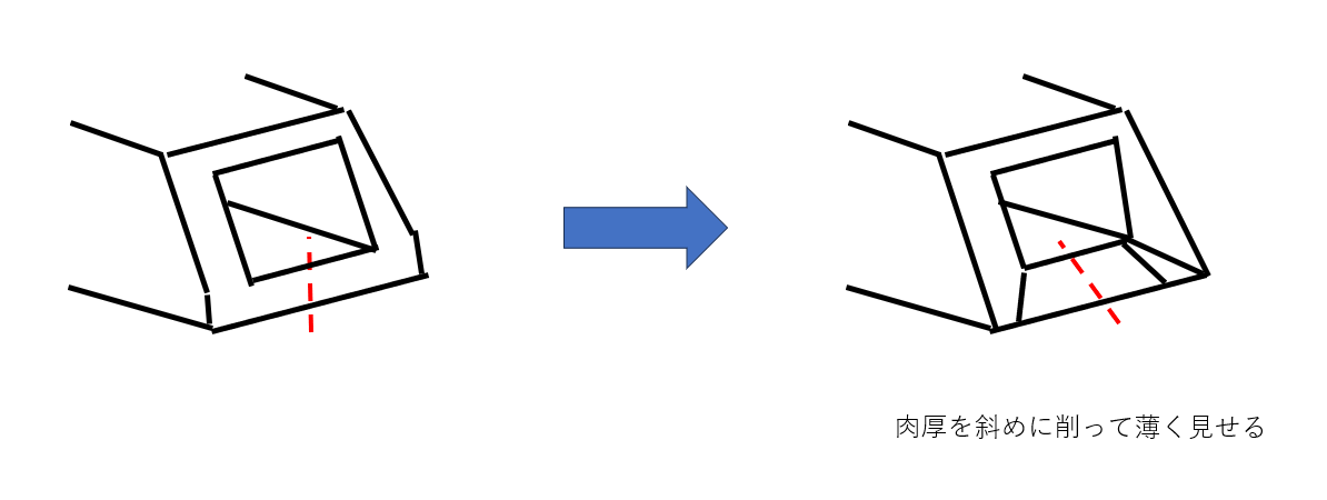 角度を変えると、左の処理後パーツの厚さが薄く見えます。端だけを削るだけで薄く見えるので、目の錯覚って不思議ですね。