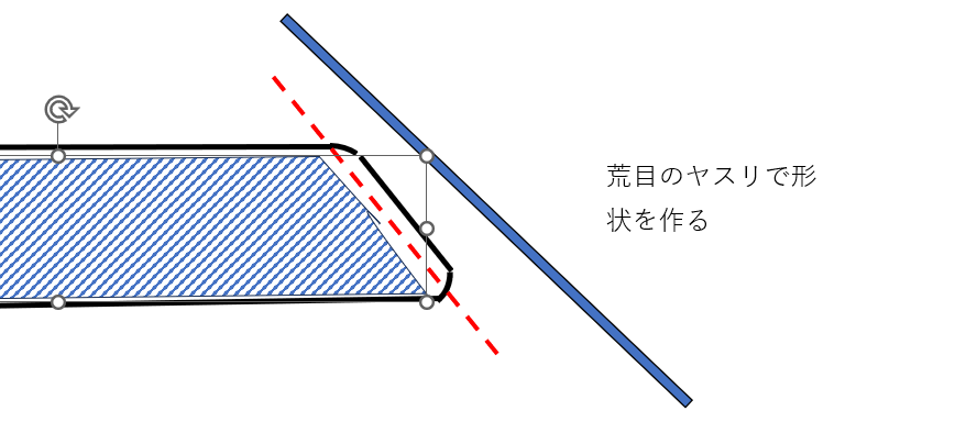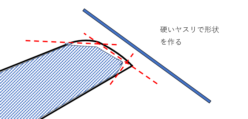 実際には図のようなイメージで、ゴッドハンドのエッジ出しヤスリで削り込みます。この場合、硬くて変形しないヤスリの本領発揮です。